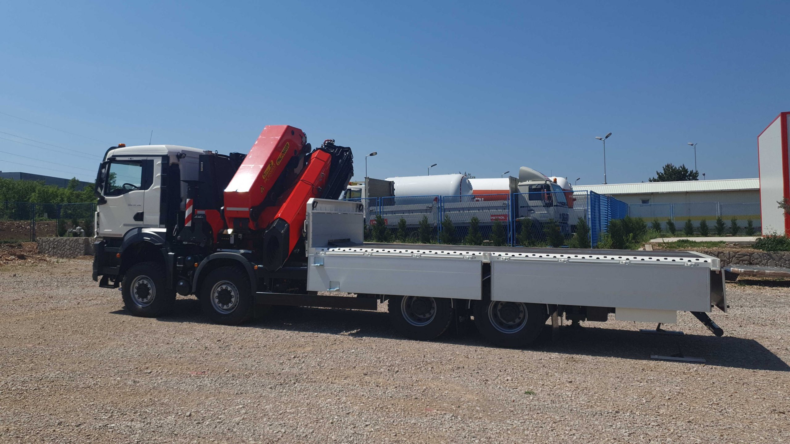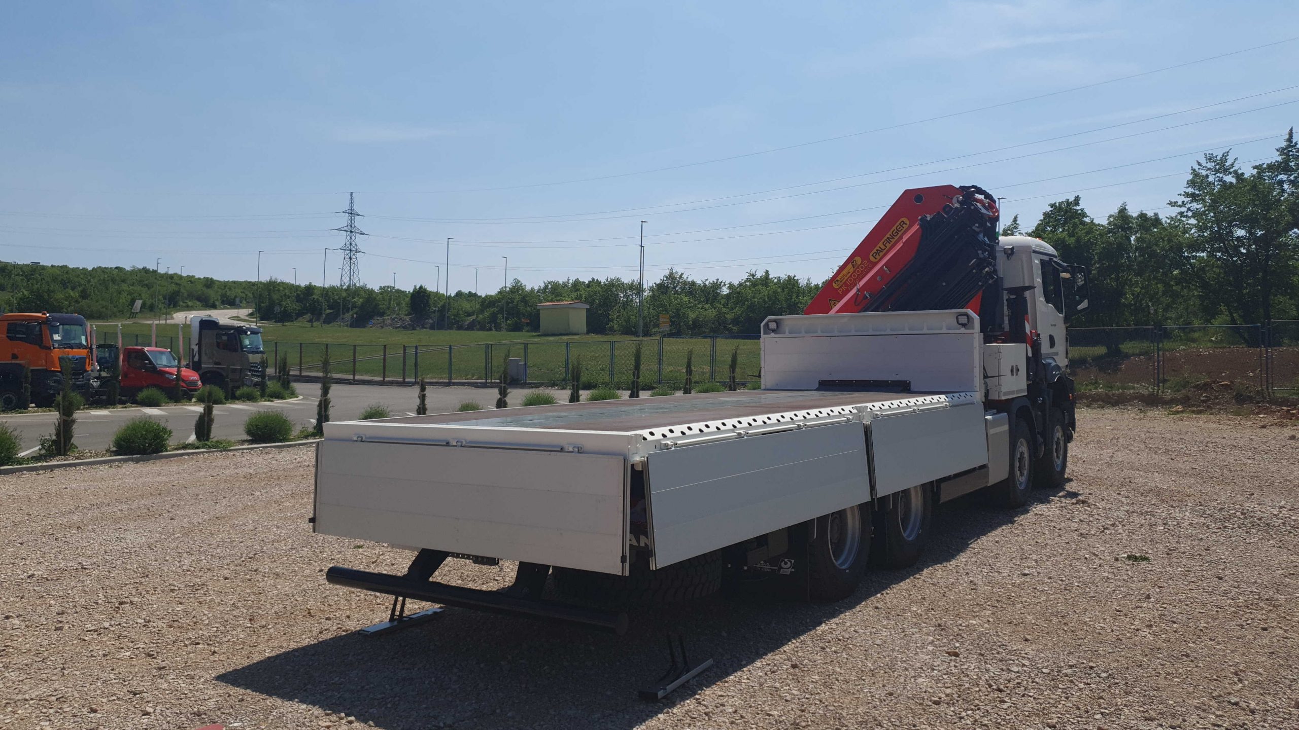 Palfinger dizalice PK 100002 imaju maksimalni podizni kapacitet 30.000 kg i maksimalnog dohvata 22 m. Opremljene su radnom košarom nosivosti 300 kg za radove na visini koja se brzom spojkom. Kamion je opremljen s 5 stabilizatora za bolji stabilitet pri manipulacijama tereta. Dizalice imaju HPSC kontrolu stabilnosti koji se koristi u sitaciji gdje nema dovoljno mjesta za maksimalno izvlačenje stabilizatora. HPSC kontrola stabilnosti preračunava dijagram nosivosti osvisno o stupnju izvučenosti stabilizatora. Dizalicom se upravlja putem radio-upravljanja što značajno ubrzava i olakšava manipulaciju teretom. Osim dizalica na četveroosovince je montiran sanduk model TS-6.2 dužine 6.200 mm s aluminijskim stranicama. Sanduk je konstruiran sa skošenim otvorima za vezivanje tereta na svakih 280 mm. Aluminijske stranice imaju sklopive stepenice s rukohvatom za pristup sanduku. Srednji i stražnji stupići su sklopivi i demontažni u slučaju potrebe za transportom širih tereta. U tom slučaju sanduk se ponaša kao otvorena platforma za transport tereta. Prednji zid opremljen je s dva radna reflektora te kukama za odlaganje gurtni. Cijeli kamion opremljen je s 6 radnih reflektora I čak 3 kutije za alat.